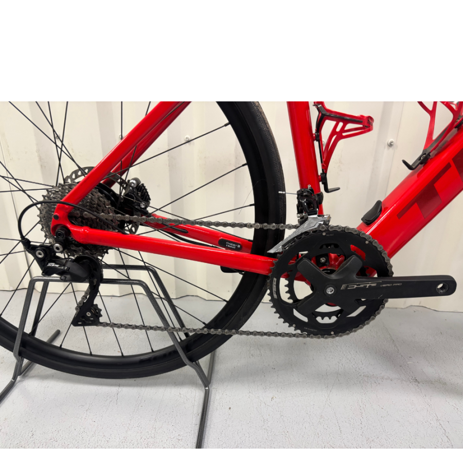 Le vélo de route d'occasion Trek Domane + AL5 est à assistance électrique et en aluminium Alpha Série 100. Il est équipé d'une transmission Shimano 105 mécanique 11 vitesses, d'un système d'assistance au pédalage Hyena de 250W dans la roue arrière et d'une batterie de 250 Wh.