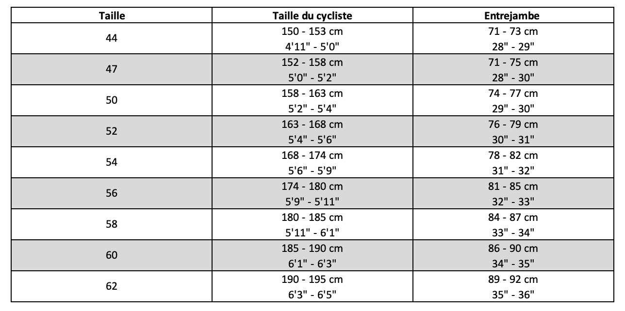 Guide des tailles :