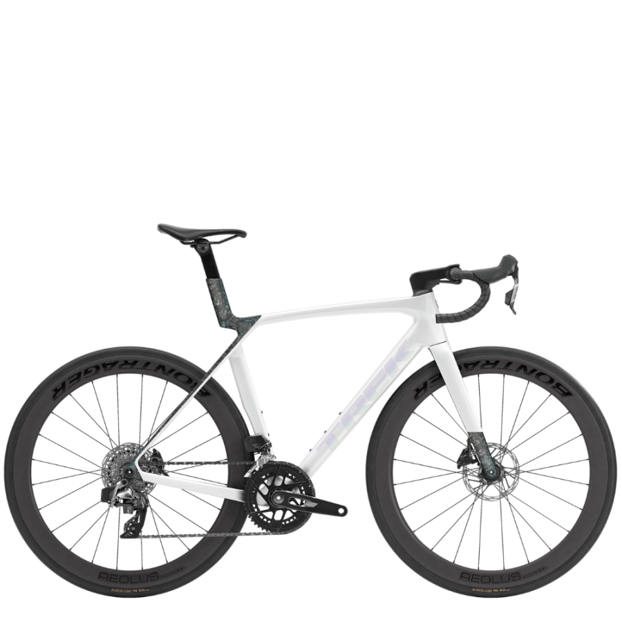 • Fourche : Madone 8e gen, tout en carbone, douille de direction conique carbone, acheminement interne des câbles de frein, freins à disque à fixation Flat-Mount, axes traversants cannelés de 12x100mm