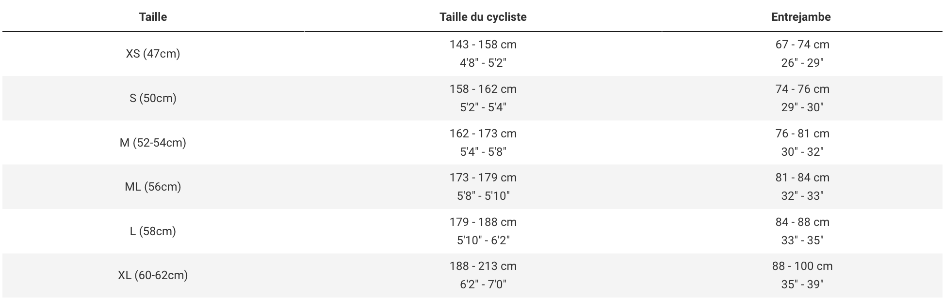 Guide des tailles :