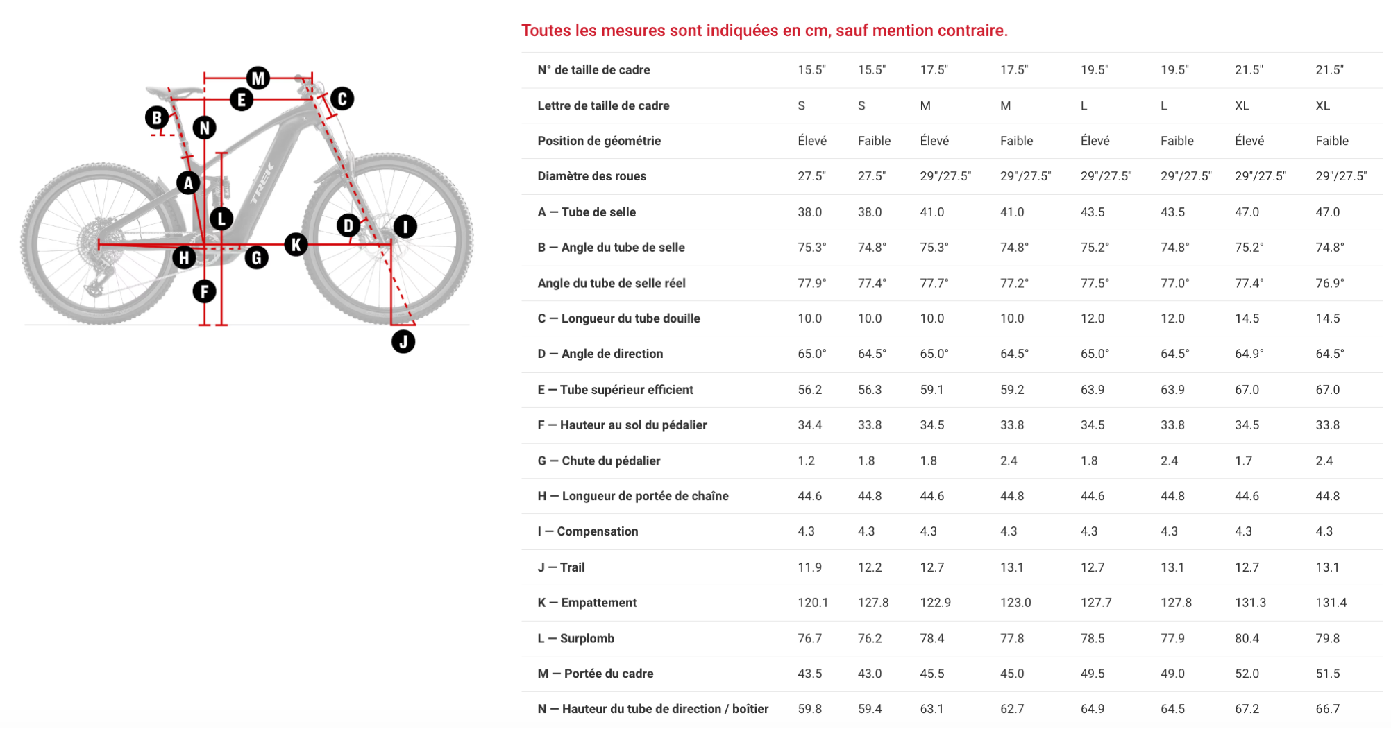 • Roues: Taille S: 27,5" à l'avant et à l'arrière - Taille M, L, XL : 29" à l'avant et 27,5" à l'arrière