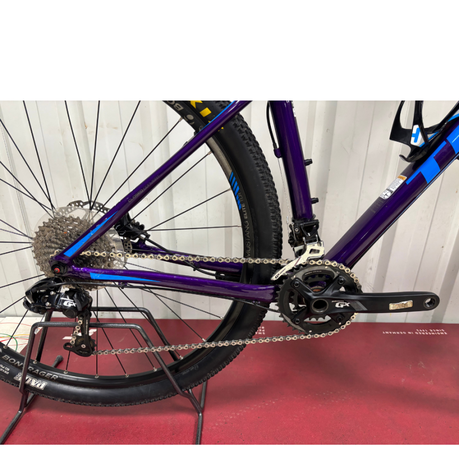 Le VTT d'occasion Trek Superfly 6 est en aluminium. Il est équipé d'une transmission Sram GX 10 vitesses et de roues Bontrager Mustang.